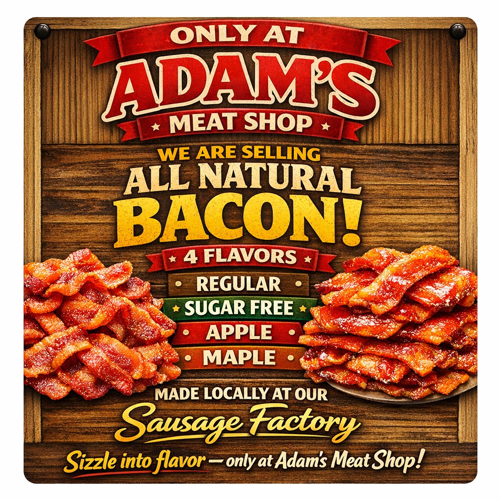 Bacon that's pure, crispy and all natural, now in 4 flavors! Get yours only at Adam's Meat Shop!